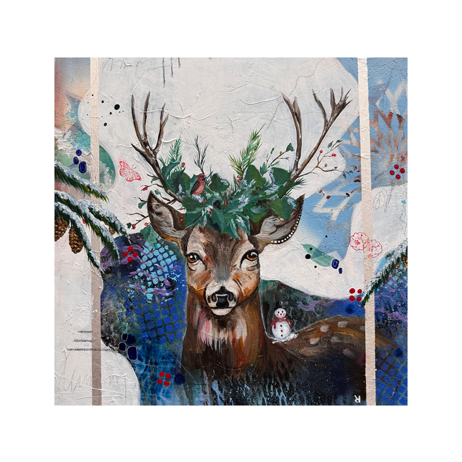 A gentle reindeer stands against a soft white backdrop, evoking the stillness of freshly fallen snow. Its large, soulful eyes gaze directly at you, as if inviting a silent conversation. There’s a quiet curiosity in its expression—part wonder, part wisdom—as though it knows the secrets of the season. Resting delicately on its antlers are sprigs of holly, clusters of red berries, and festive Christmas leaves, adding a cheerful and magical flair.Perched playfully on its shoulder is a tiny snowman, almost like a little companion, complete with a carrot nose and twig arms. The contrast of the reindeer's steady gaze and the snowman's joyful presence creates a perfect harmony playful yet serene. Altogether, the painting captures a moment of whimsical winter magic, where innocence and wonder meet in the most unexpected ways.
