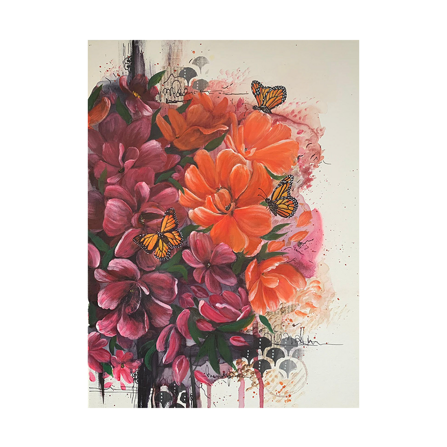 Titliya, meaning "butterflies" in Hindi, is a joyful escape into a garden imagined through brush and ink. Painted in moments of longing for nature, it brings together vibrant flowers and fluttering Monarch butterflies. The canvas becomes a sensory memory, full of movement, warmth, and color. It celebrates the beauty of small, fleeting things that bring comfort and joy. Titliya is not just about butterflies — it's about the freedom to feel, wander, and bloom from within.