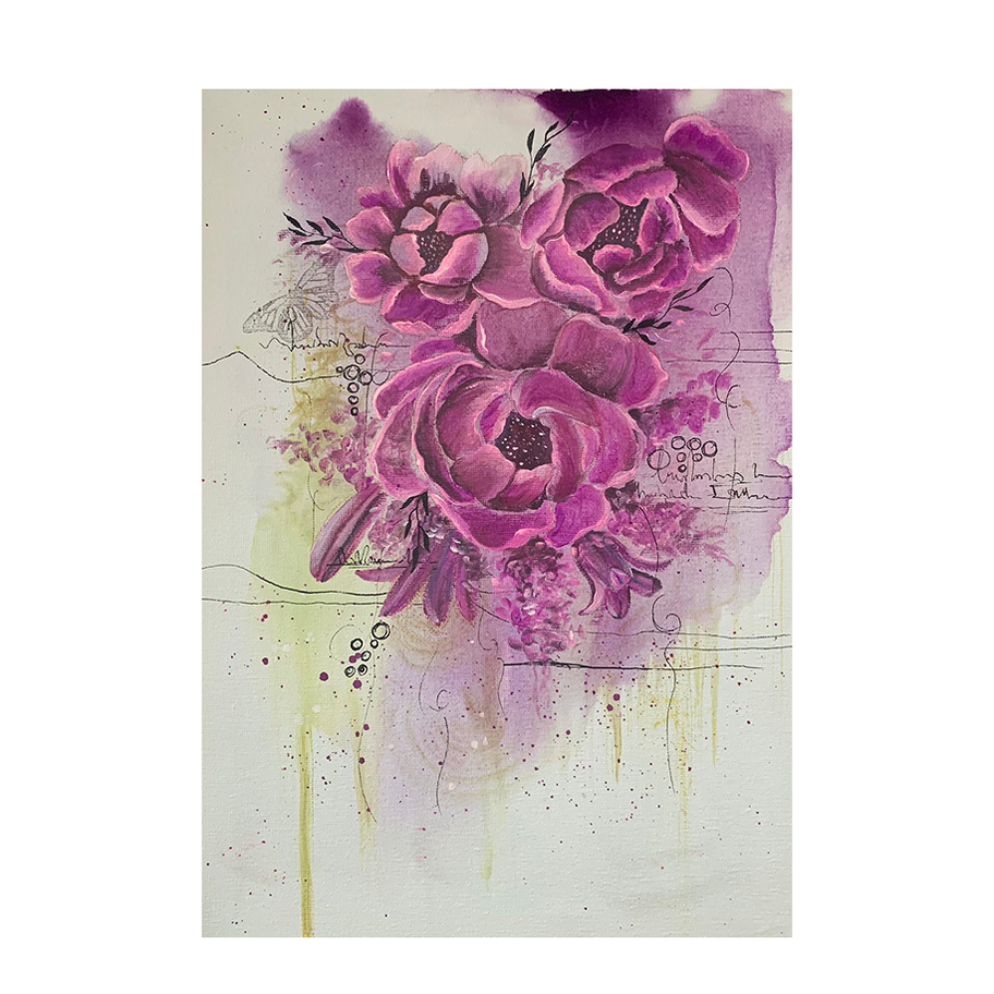 Set against a dreamy monochrome background of purple and white, three delicate flowers bloom with quiet elegance. Though imaginary, they feel alive — each petal a soft echo of emotion and imagination. The limited palette enhances their presence, letting light and shade bring depth and vibrancy to the scene. These blossoms aren't bound by nature, but born from feeling and creative freedom. Whispers in Purple is a celebration of the beauty that exists in the unseen and the imagined.